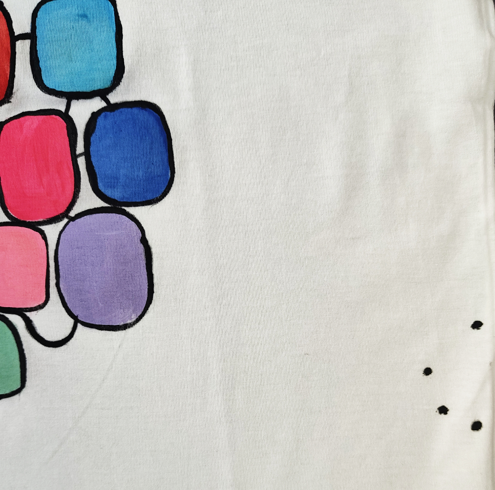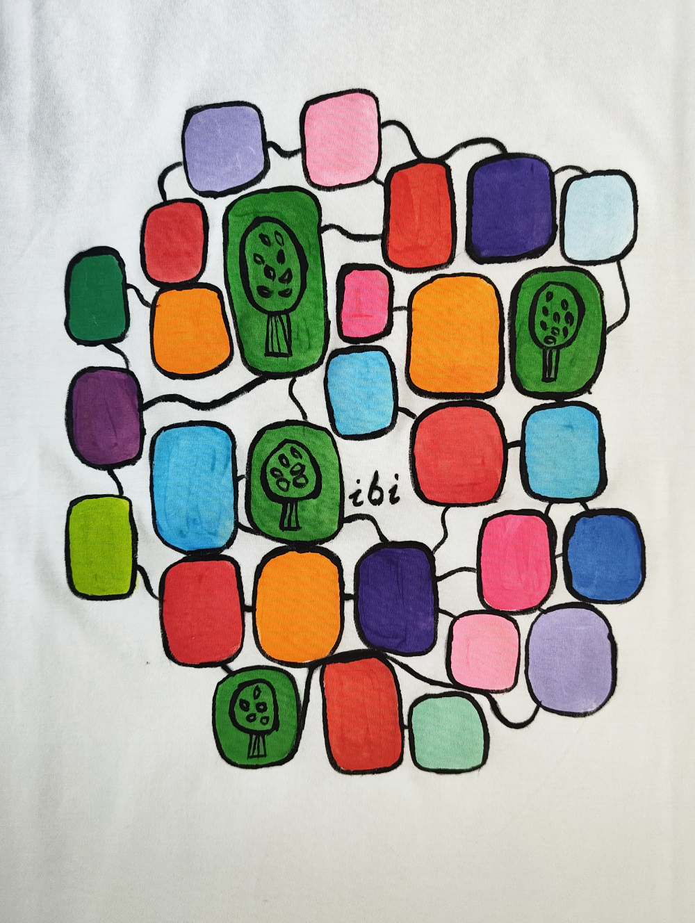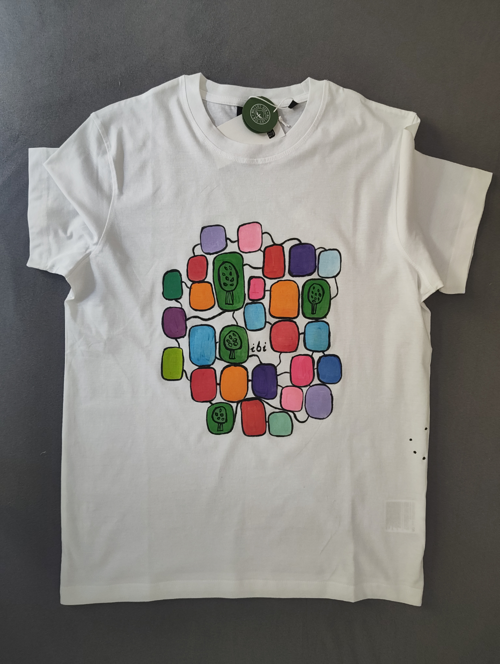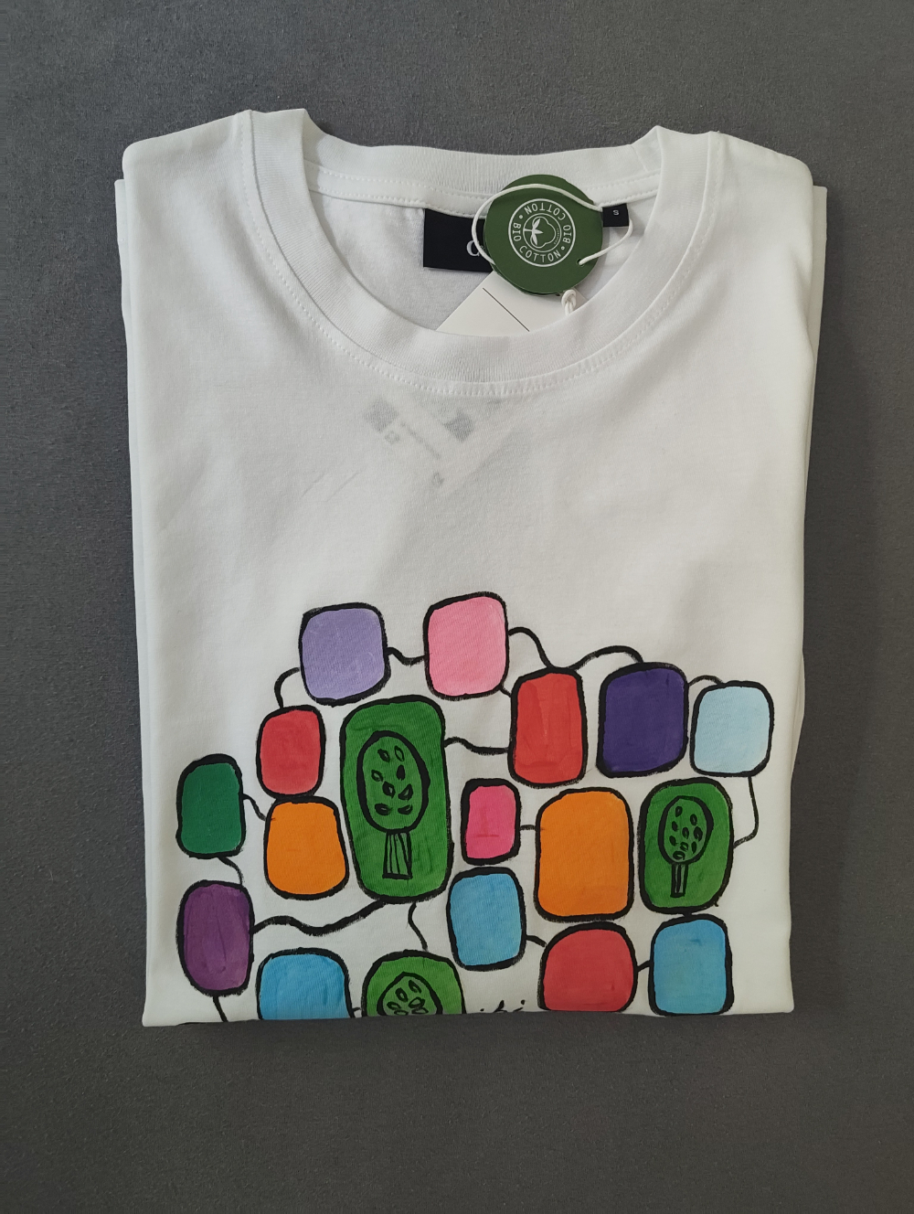 Das „Ecosystem“ T-Shirt ist mehr als nur Kleidung; es ist eine Visualisierung des Lebens. Die bunten, abgerundeten Felder stehen für verschiedene Lebensräume oder Ideen, die durch ein feines Netzwerk miteinander verknüpft sind. Inmitten dieser Struktur finden sich stilisierte Bäume, die dem abstrakten Werk eine organische Erdung verleihen. Ein handgemaltes Kunstwerk, das die Balance zwischen Natur und Struktur feiert.