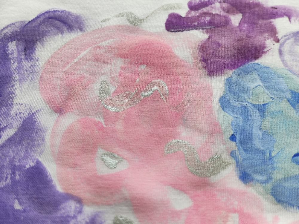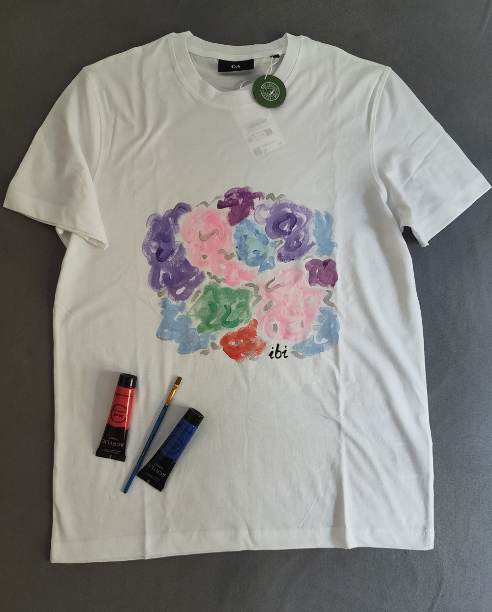 Dieses handbemalte T-Shirt in Größe S verbindet hochwertige Baumwolle mit kreativem Design. Auf dem weißen Stoff entsteht ein lebendiges, abstraktes Blumenmotiv in Rosa, Violett, Blau und Grün, ergänzt durch kleine rote Akzente. Die lockeren Pinselstriche verleihen dem Design eine spielerische und moderne Ausstrahlung.