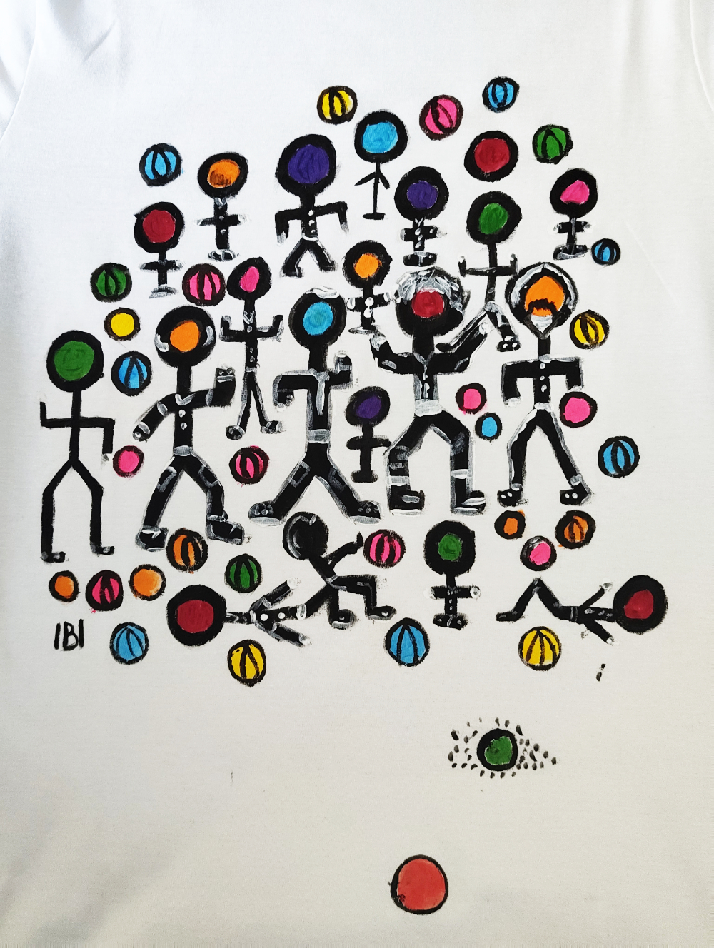 Das farbenfrohe und lebendige Motiv zeigt fröhliche Strichmännchen in Bewegung auf einem Spielplatz. Die Szene vermittelt Leichtigkeit, Lebensfreude und kindliche Unbeschwertheit und lädt dazu ein, den Alltag für einen Moment hinter sich zu lassen. Durch die spielerische Darstellung und die ausdrucksstarken Farben wird das T-Shirt zu einem echten Blickfang und zu einem tragbaren Kunstwerk, das Individualität und Kreativität ausstrahlt.